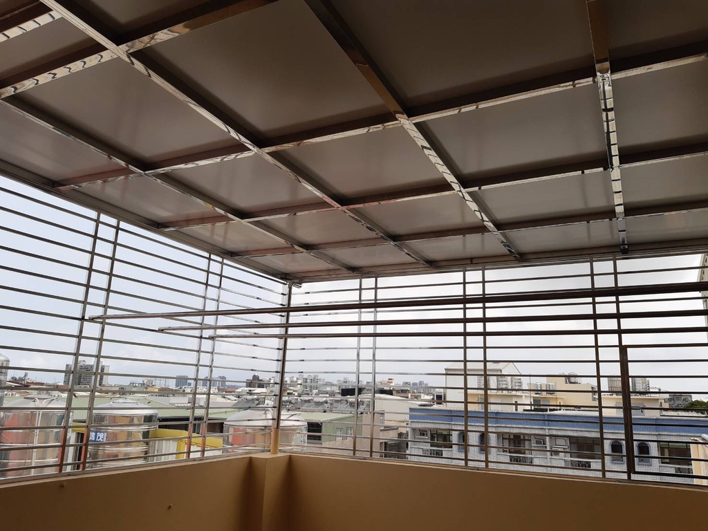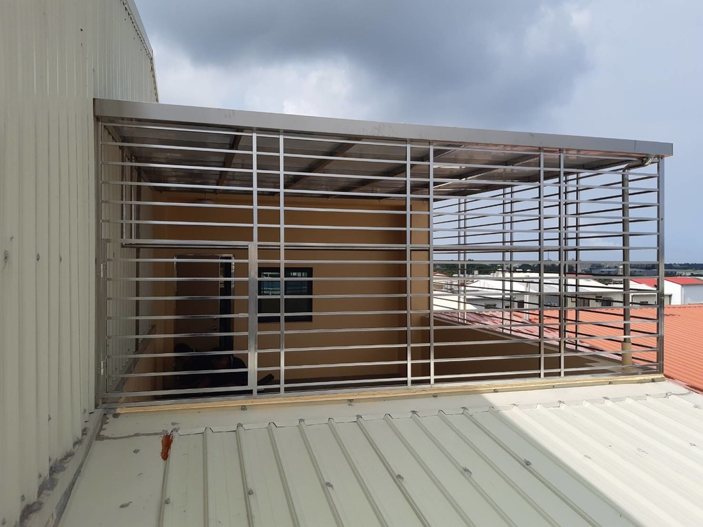 不鏽鋼材質,颳風下雨不用怕生鏽損壞,佳鋐施作牢固,邊邊幫我們留了一個可開式的窗口。