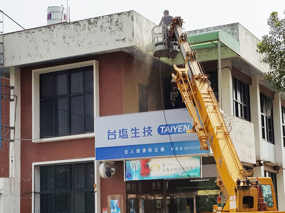 先處理外牆的部分,清水柱沖洗,專業工作人員俐落的清洗牆面。