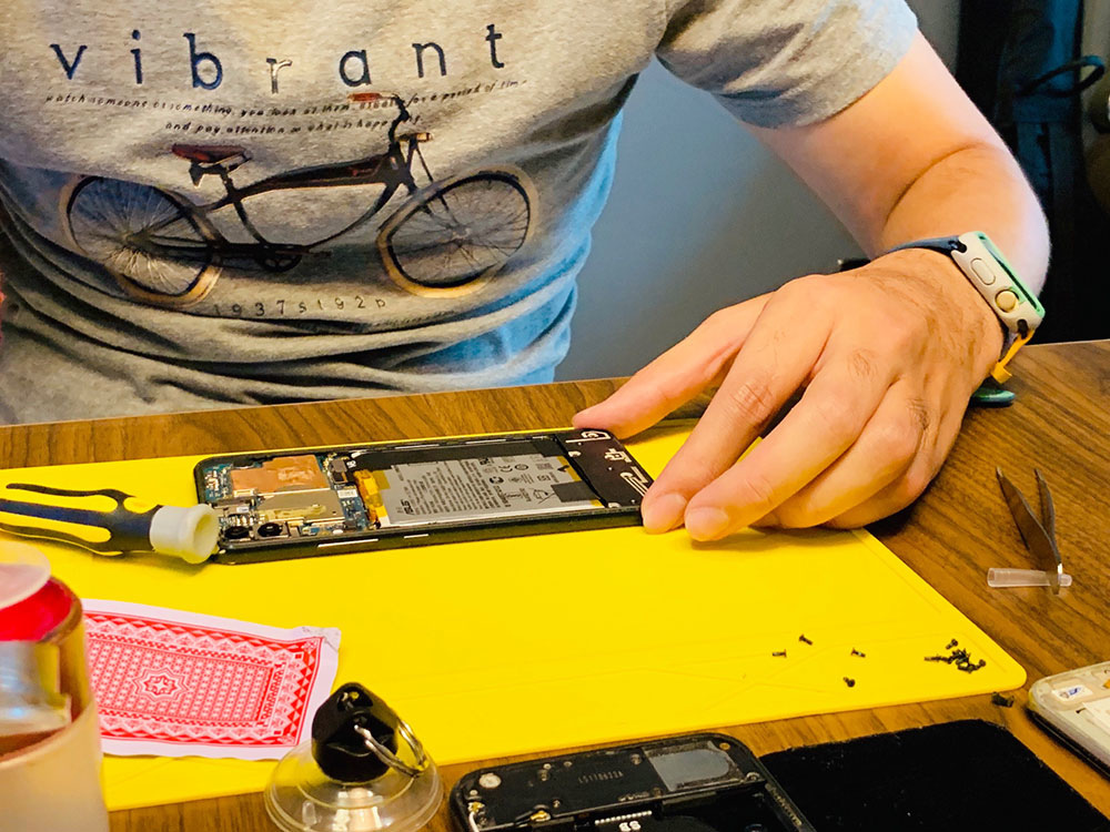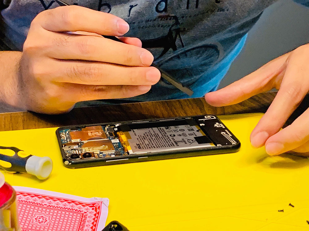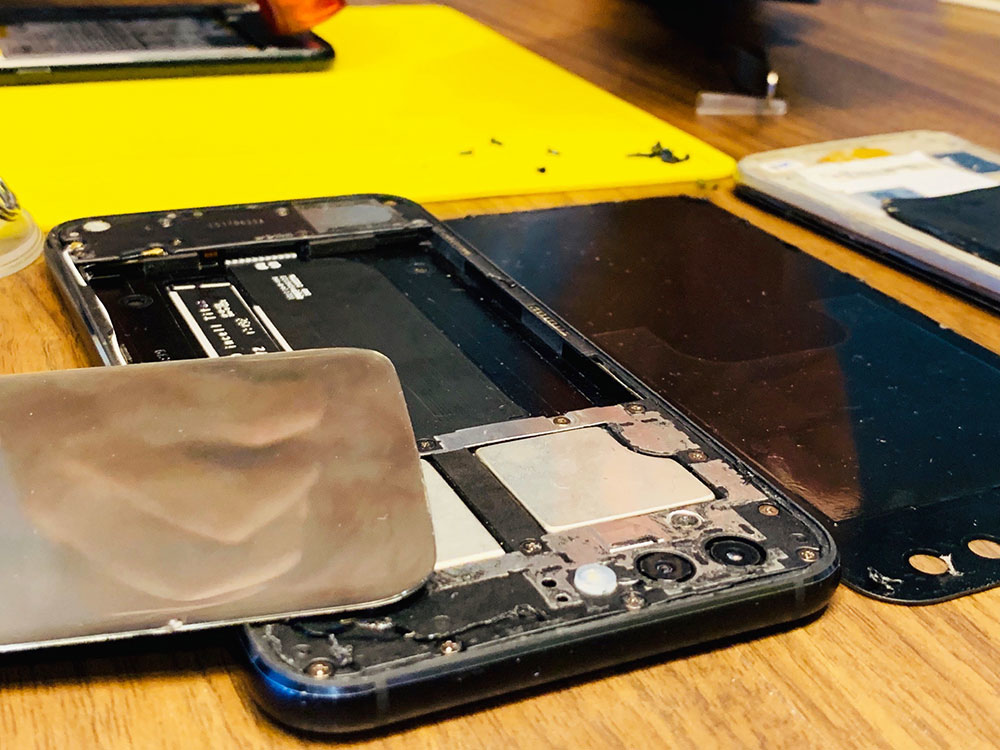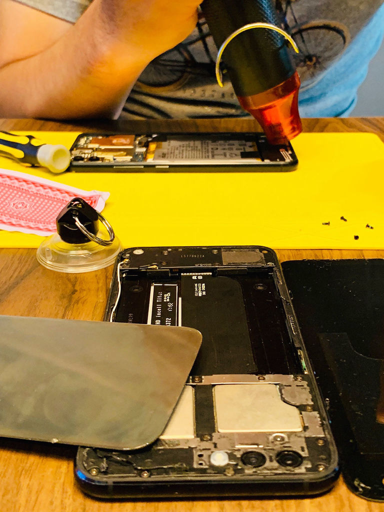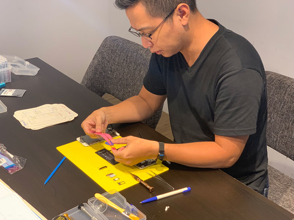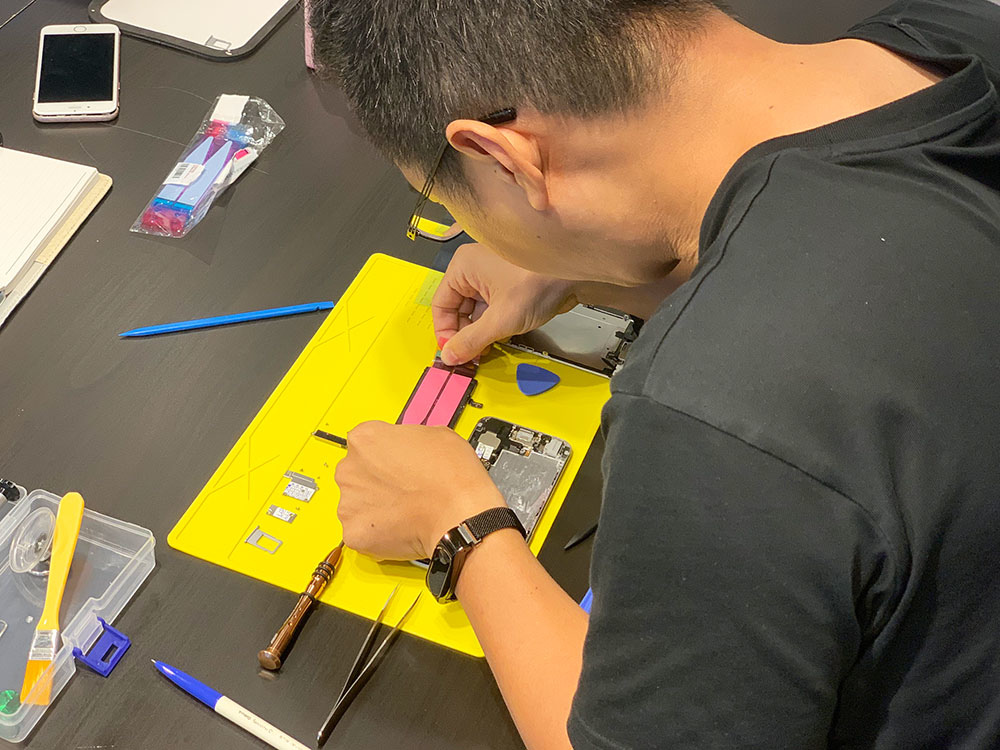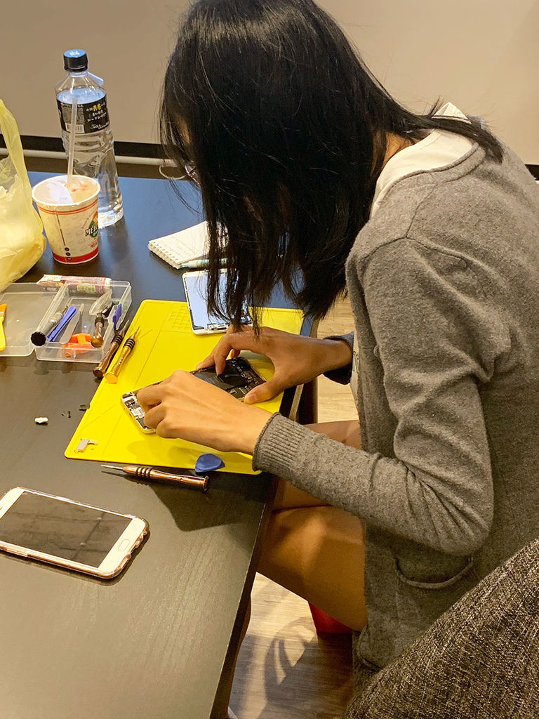 這是我正在修的手機,在宅瘋修上課,教室會送工具組、維修工作墊等等相關維修配備,上課只要人來就好了~