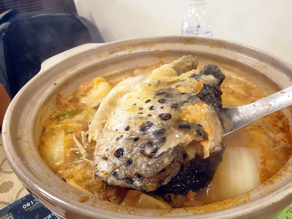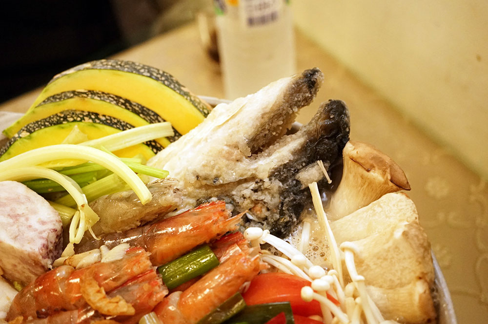 與一般砂鍋魚頭的魚類不同,老闆選用鮭魚,為了保持魚的鮮度,下鍋前會先炸過,再放進鍋裡煮,複雜的手續也煮出美味又具層次的魚肉。不手軟的一整大塊就這樣乖乖的躺在我們鍋裡。