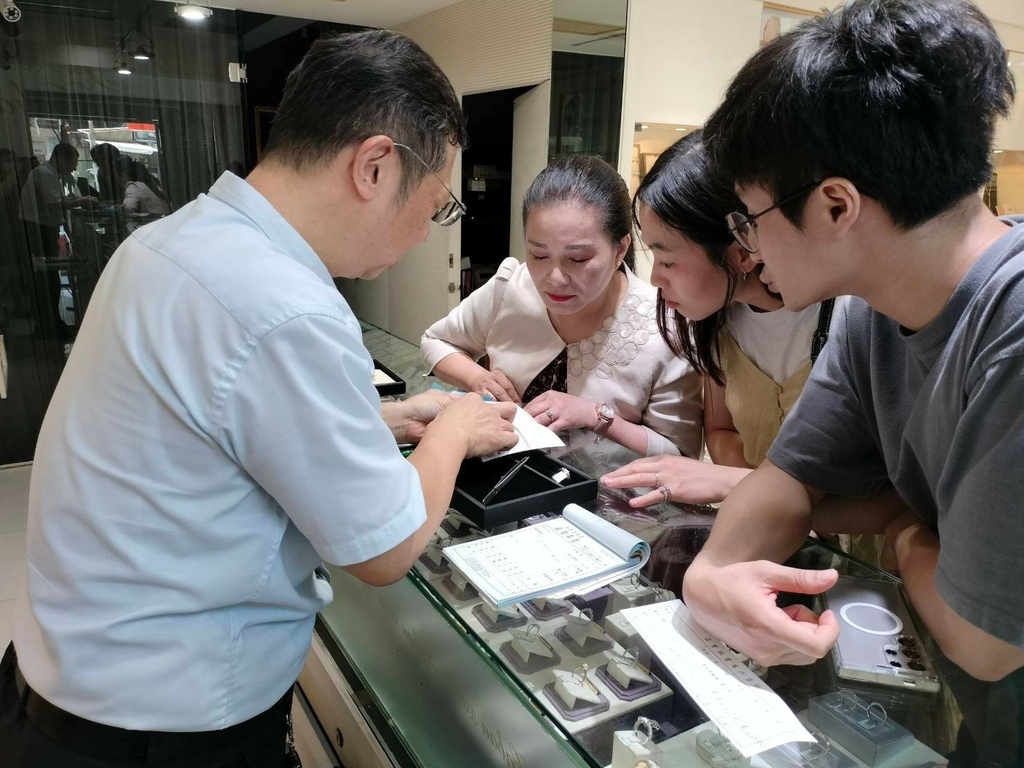 老闆先細心詢問我弟的喜好,再拿出多款鑽戒讓他們比較。從簡約素雅到華麗鑲鑽,每一款都有自己的特色。看著弟弟和準新娘專心聽老闆解說,我心裡滿滿感動。