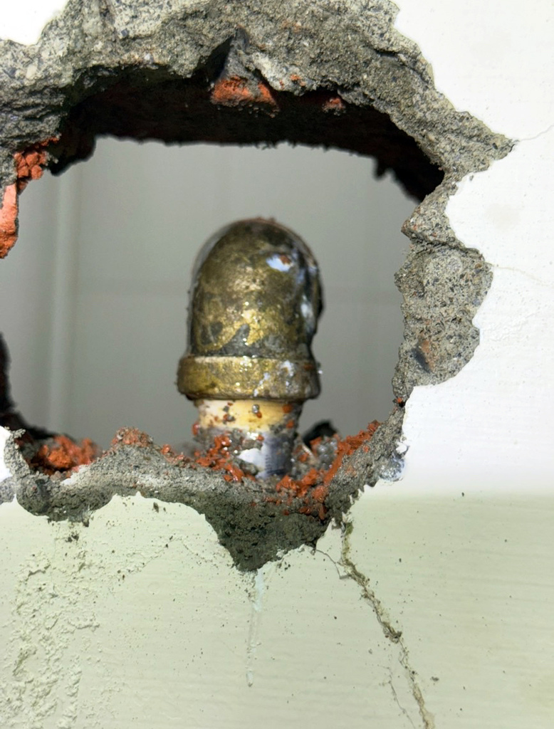 ▼淋浴柱的熱水管路中的彎頭破裂了,導致水不斷滲出。