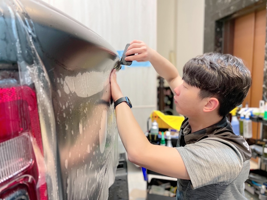 ▼噴上XPEL專用安裝液,一邊拉平膜料一邊用刮板將裡面空氣推擠出來